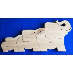 Houten puzzel in de vorm van drie olifanten in kolonne....