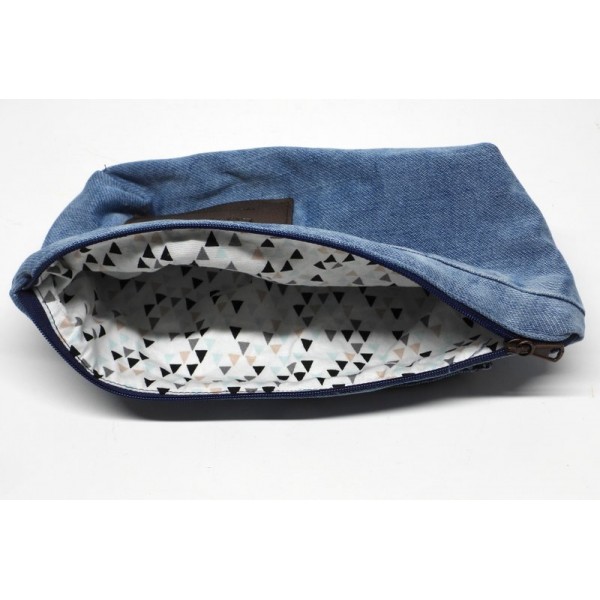 Etui van spijkerstof. De voering is van oker/wit/grijs/ zwarte driehoekjes. De lengte is 25 cm.