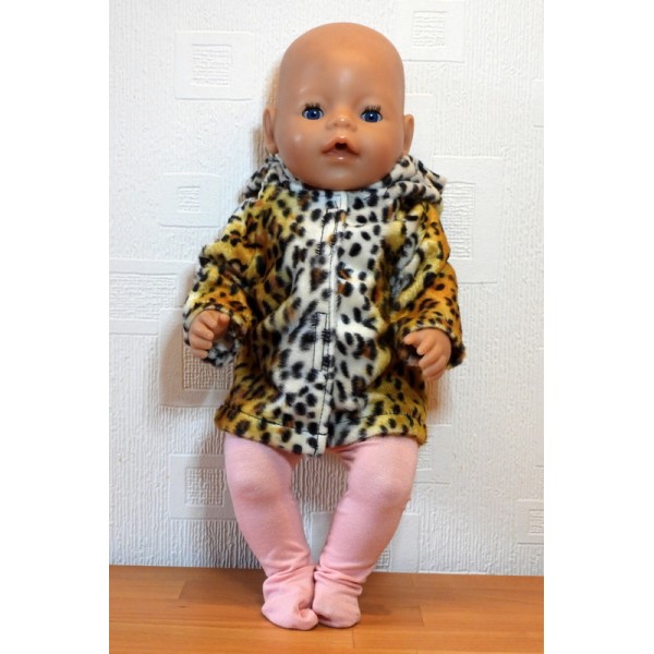Bruine panter jas met oker gele voering in de capuchon.