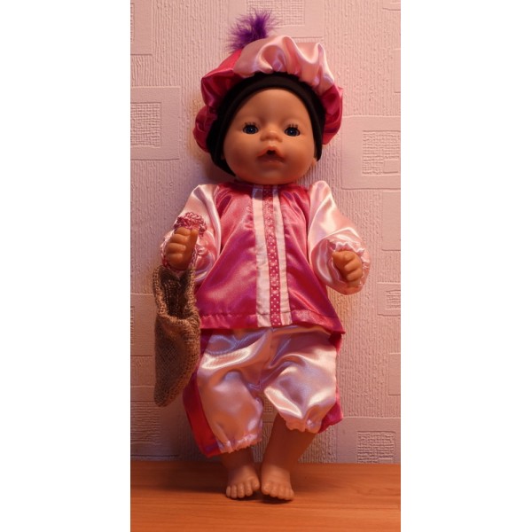 Het pak bestaat uit een broekje, jasje, baret en jute zakje.