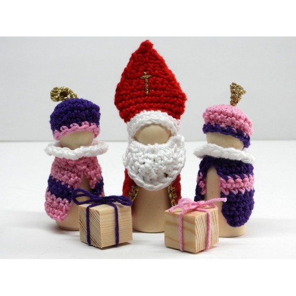 Setje van sint en 2 pieten in groen en geel en 2 cadeautjes.