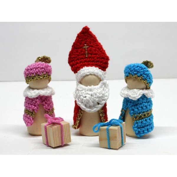 Setje van sint en 2 pieten in groen en geel en 2 cadeautjes.