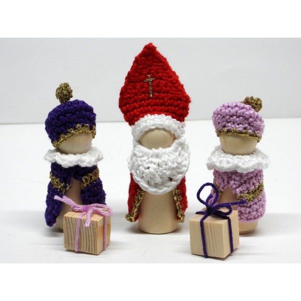 Setje van sint en 2 pieten in groen en geel en 2 cadeautjes.