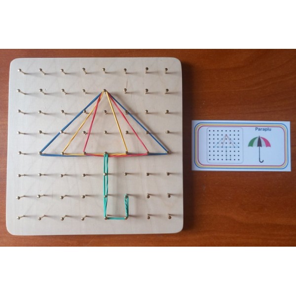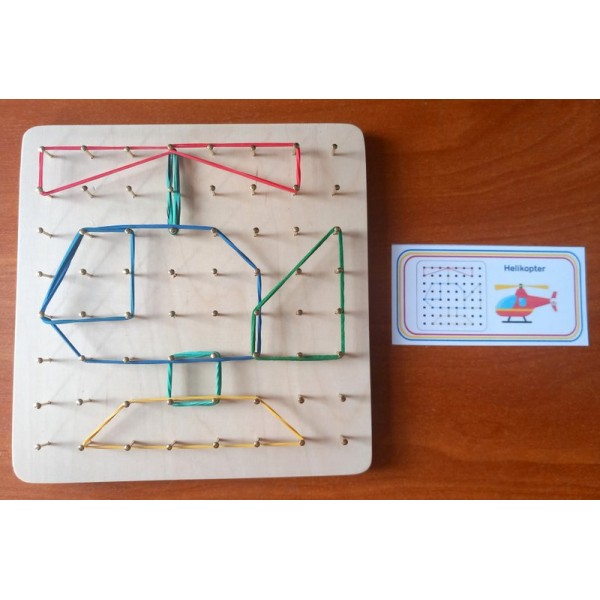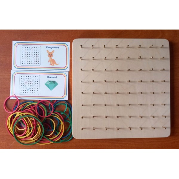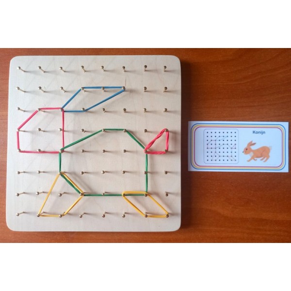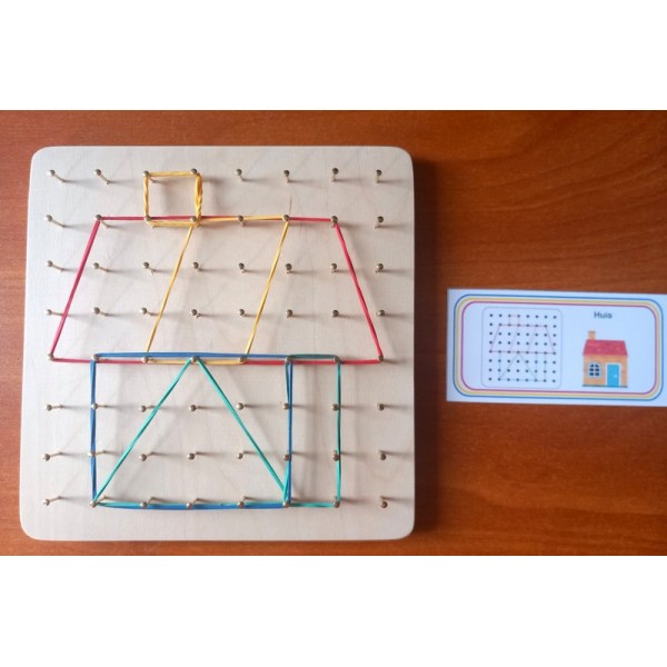 Houten bordspel met 64 spijkertjes. Speelgoed met elastiekjes om figuren mee te maken. Is ook wel bekend onder de naam geobord.