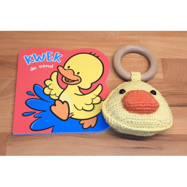 Bijtring met kikker en boekje Kwak de kikker. De ring is van beukenhout.