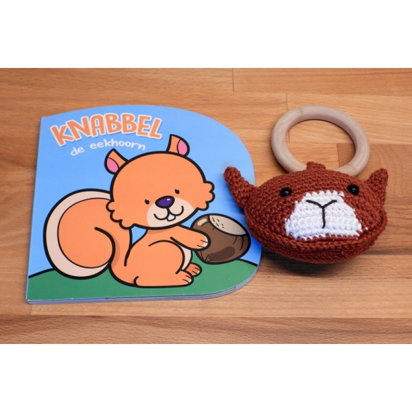 Bijtring met giraf en boekje Charlie de giraf. De ring is van beukenhout.