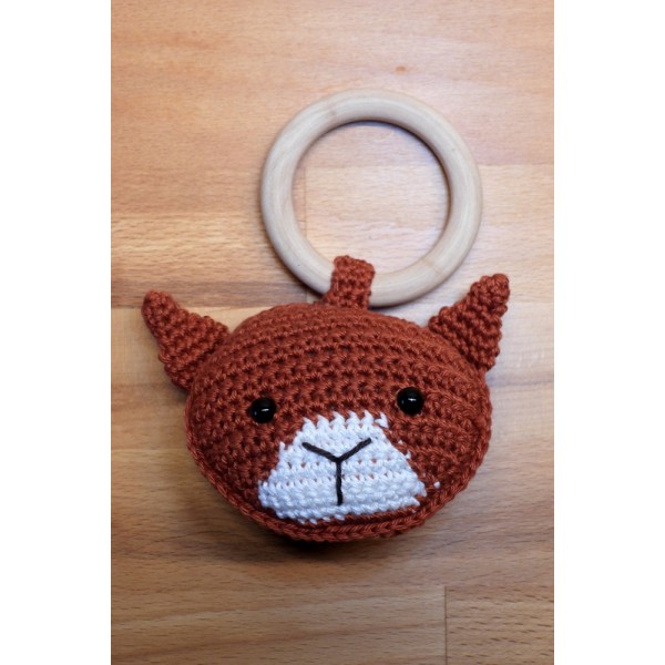 Bijtring met hond en boekje Hector de hond. De ring is van beukenhout.