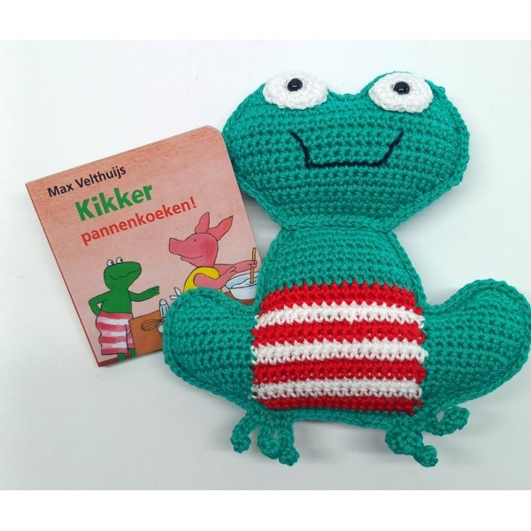 Gehaakte kikker en varkentje. Samen met boekje "Kikker pannenkoeken".