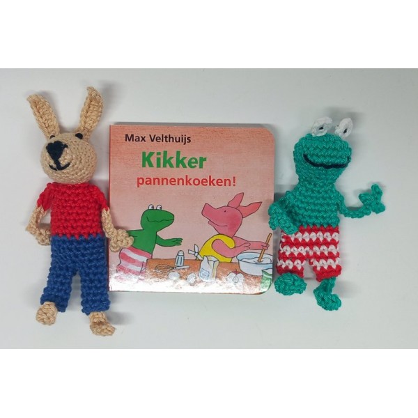 Gehaakte kikker en varkentje. Samen met boekje "Kikker pannenkoeken".
