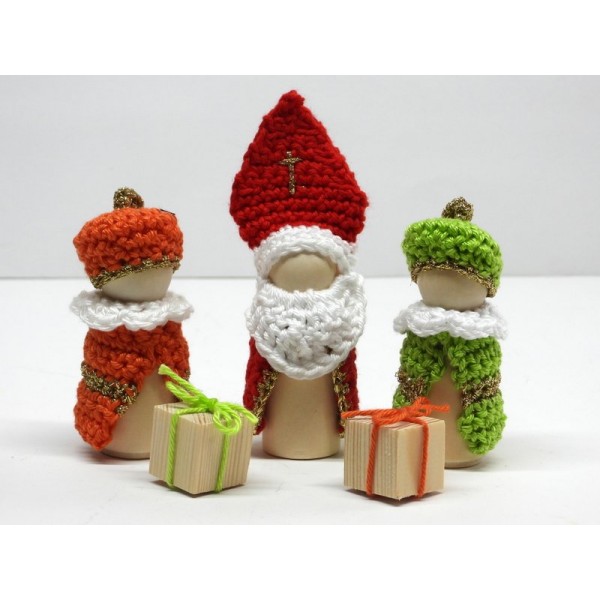 Setje van sint en 2 pieten in groen en geel en 2 cadeautjes.