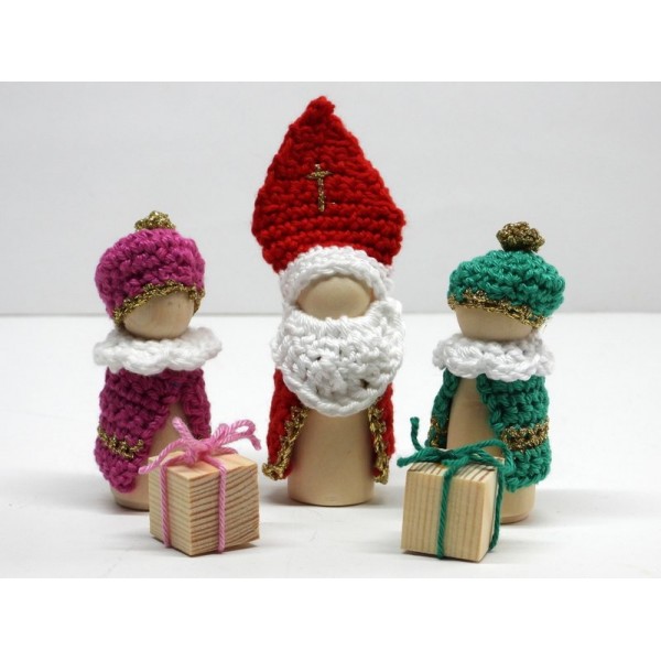 Setje van sint en 2 pieten in groen en geel en 2 cadeautjes.
