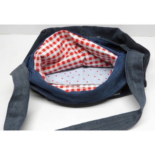 De tas is ook vooorzien van een rits en heeft een blauw/wit/rood geruite binnenkant.