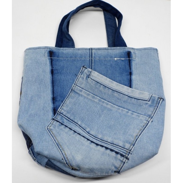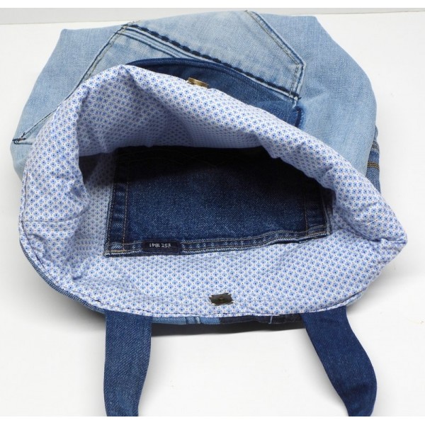 Shopper met een "patchwork" voorkant, gemaakt van allerlei stukjes van zakken.