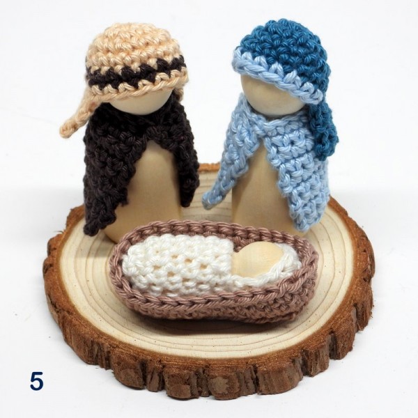 Gehaakte set in blauw en bruin. Jozef, Maria en het kindje Jezus in de kribbe.