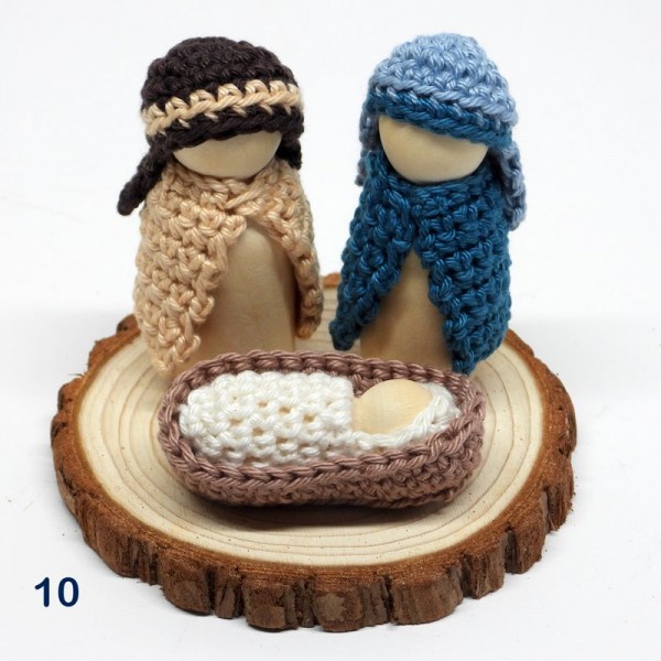 Gehaakte set in blauw en bruin. Jozef, Maria en het kindje Jezus in de kribbe.