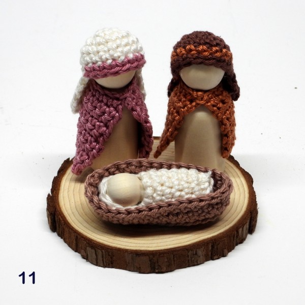 Gehaakte set in bruin en roze. Jozef, Maria en het kindje Jezus in de kribbe.