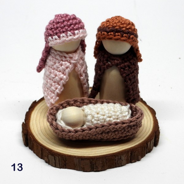 Gehaakte set in bruin en roze. Jozef, Maria en het kindje Jezus in de kribbe.