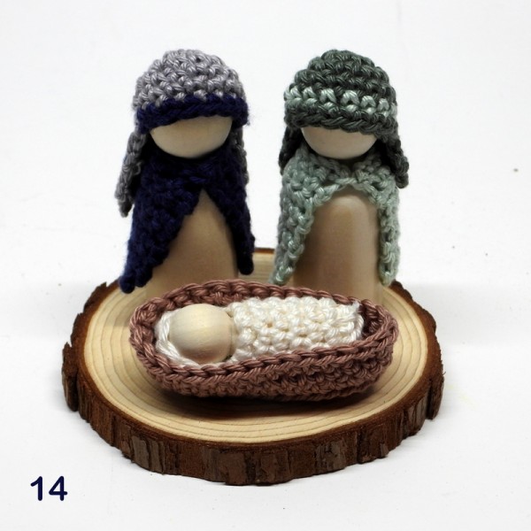 Gehaakte set in blauw en beige. Jozef, Maria en het kindje Jezus in de kribbe.