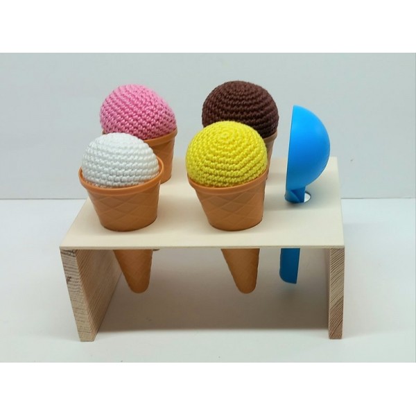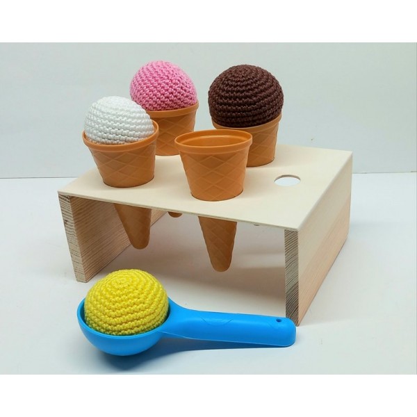 Een speelset voor buiten met 4 ijshoorntjes in een standaard en een ijslepel om bolletjes te maken.