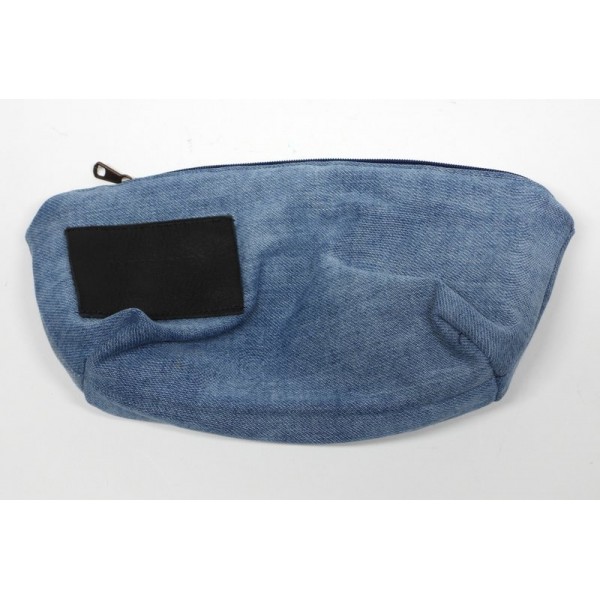 Etui van spijkerstof. De voering is ook van licht blauwe spijkerstof. De afmeting is ong. 23cm.