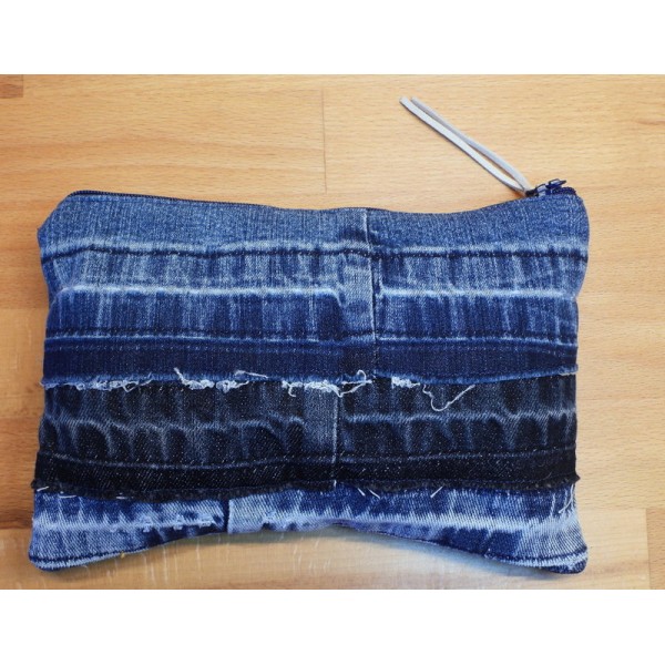 Etui van spijkerstof. De voering is ook van licht blauwe spijkerstof. De afmeting is ong. 23cm.