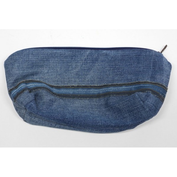 Etui van spijkerstof. De voering is ook van licht blauwe spijkerstof. De afmeting is ong. 23cm.