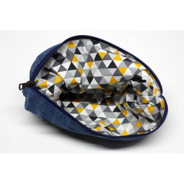 Etui van spijkerstof. Voering is van gekleurde driehoekjes. De lengte is 25 cm.
