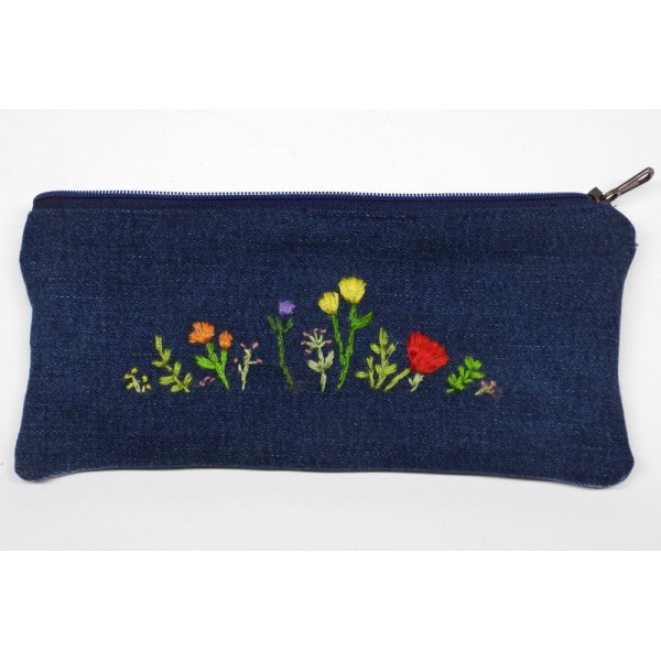 Etui van spijkerstof. De voering is van licht blauwe spijkerstof. De lengte is 23cm.