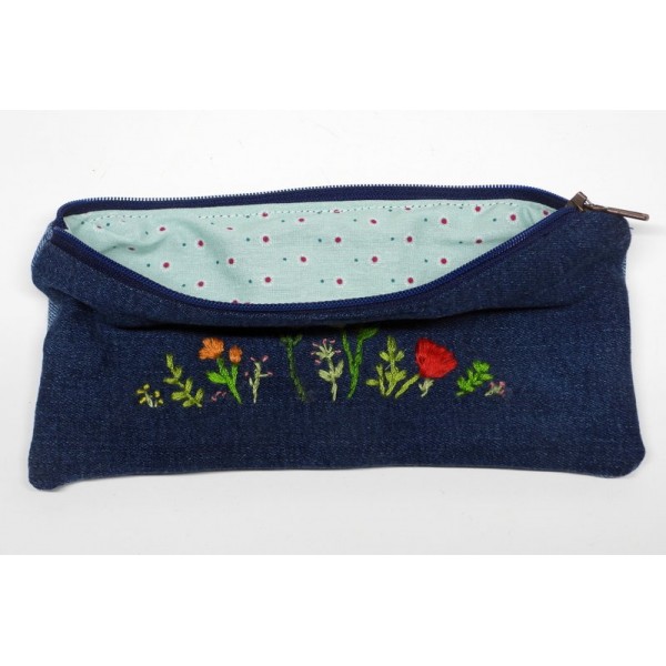 Etui van spijkerstof. De voering is ook van licht blauwe spijkerstof. De afmeting is ong. 23cm.