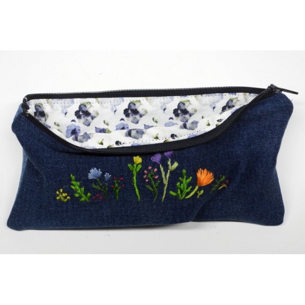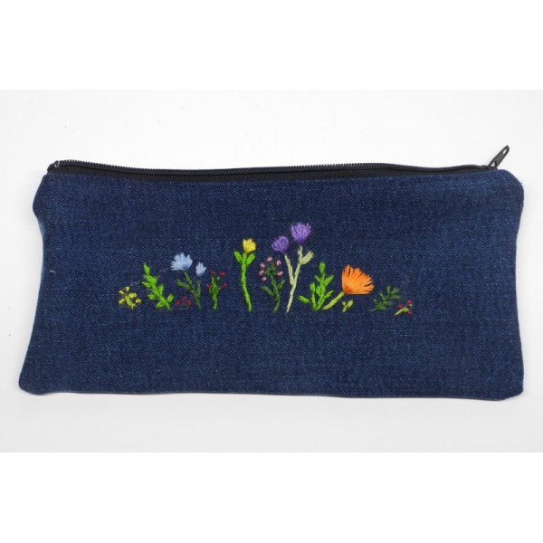 Etui van spijkerstof. De voering is van licht blauwe spijkerstof. De lengte is 23cm.