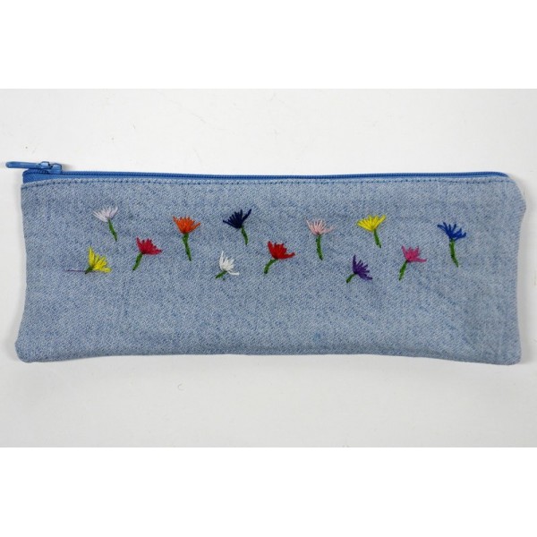 Etui van spijkerstof. De voering is van licht blauwe spijkerstof. De lengte is 23cm.