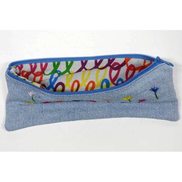 Etui van spijkerstof. Voering is van gekleurde driehoekjes. De lengte is 25 cm.