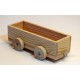 locomotief, lage wagon met open bak, wagon met boomstammen en een kiepwagon. Blank hout