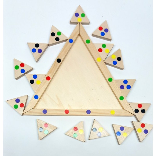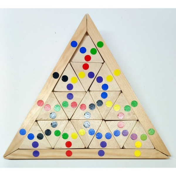Op de driehoeken staan gekleurde stippen en deze moeten exact corresponderen met de andere driehoeken en de stippen op de zijkant.